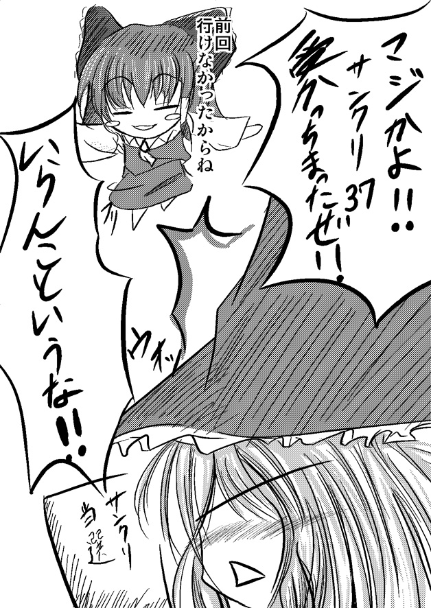 明日は「紅月ノ宴」のイベント日ですね(^^ そのせいか1ヶ月ほど放置の俺のブログが 最近ありえないほどの人が来ているみたいで・・・・・・・ あ~ もう色々楽しみですwww ですが今回自分のサークル予定していた本が どうにもこうにも印刷会社の締め切りに間に合わなくorz ごめんちゃい~♪ なので当日の配布物は 急遽鉛筆で描いたペライコピー誌と 活動報告が書かれたペラペラフリーペーパを 持って生きます(=ω=; どりらも無料です~♪ 数はあまり用意できないと思うので お一人様一部ずつで お願いいたしますです(余ること覚悟ですがね! あぁ~ 心が折れそうだぜorz ちなみに 配置スペースは「時10」です 「自重しろ!!!」 と覚えてくだされば幸いですwww(ぇ 当日は某サイトで買った「魔理沙のシルエットが描かれた服」を 着ていきますので、 それを目印にして お隣様のサークル「CRiMSONLOVER」様にお越しくださいませwww(違っ 俺のところは・・・・・みないでくd(ry それにしても俺はちゃんと会場に行けるのだろうか? 未だに会場場所がどこにあるのかさえ分からないのだけど(ぇ 追記 あっ! そうそう言うの忘れてたけど コピー誌のタイトル「Bloody ~Preface~」ですよ~(^^ 主にレミリア×パチュリーのバトル本になりそうですw 「初めて互いが出会う」 そんな始まりにすぎないお話です 2007.08.14 Tue 06:06:34